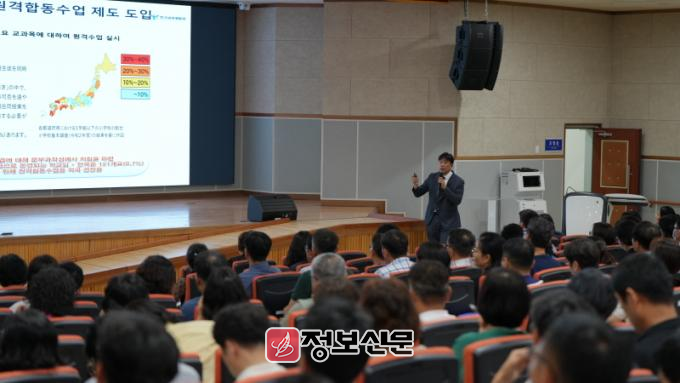 첫날인 14일 전라남도교육연구정보원에서는 ‘작은학교 리더그룹 연찬회’가 진행됐다. 한국교육개발원 권순형 박사가 ‘학령인구 감소에 대응하는 교육정책 방향’을, 일본 규슈대학교 모토카네 마사히로 교수가 ‘작은학교를 혁신하는 스쿨리더의 역할’ 특강을 했다. 두 전문가는 한일 소규모학교 정책 비교 연구를 통해 전남형 작은학교 방향과 과제를 이야기하고 작은학교 관리자의 역할과 중요성을 강조했다.
