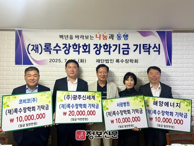 양진석 록수장학회 이사장은 “지역사회의 따뜻한 마음이 소방공무원 자녀들의 미래를 밝히는 데 큰 힘이 되고 있다”며 “특히 이번 기탁에 함께해주신 ㈜광주신세계, 코비코㈜, 서광병원, ㈜해양에너지에 깊이 감사드린다. 이같은 따뜻한 나눔이 사회에 긍정적인 변화를 이끌어낼 것으로 기대한다”고 말했다.