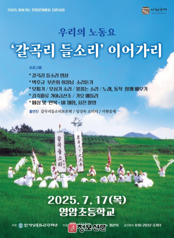 ‘찾아가는 전통문화활동 지원사업’은 영암 지역에서 사라져 가는 전통문화 활동의 맥을 이어가고자 영암 전통문화의 보존, 계승, 발전을 위해 활동을 지원하는 사업이다. 특히, ‘영암 갈곡리 들소리’는 전라남도 무형유산으로 영암군 신북면 갈곡리에서 전승되어 오는 영산강 하류 논농사를 대표하는 들노래이다.