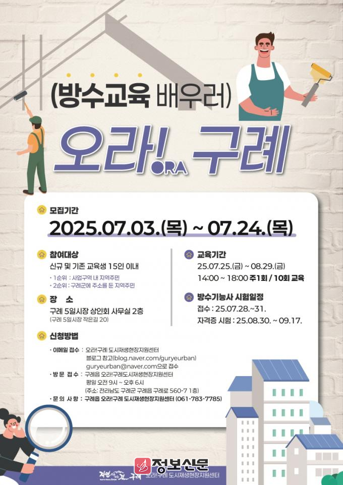 ![]() 구례군, ‘오라!구례 집수리 아카데미 4기(방수교육) 수강생 모집 |