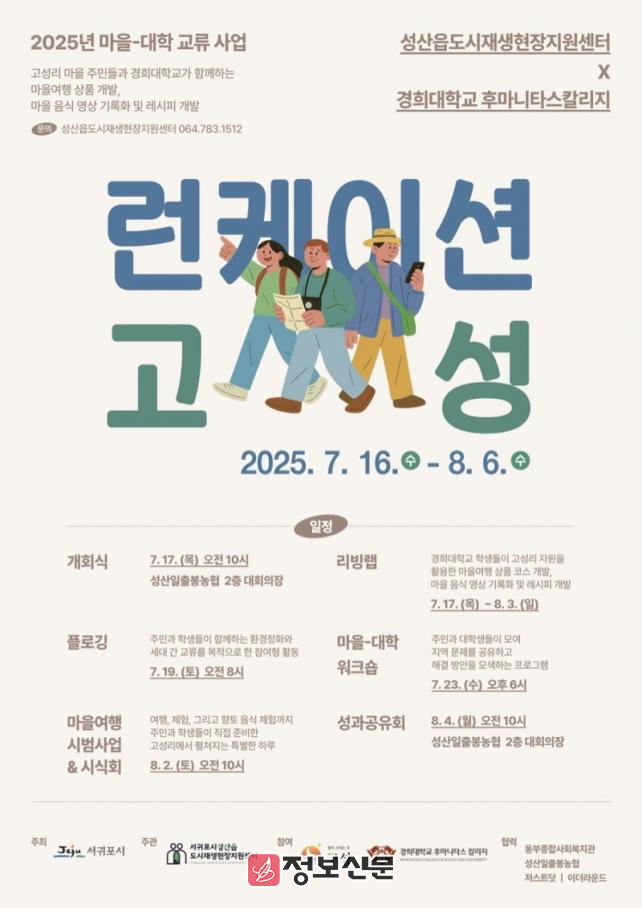 서귀포시 성산읍 도시재생현장지원센터 관계자는 “「런케이션 인 고성」은 청년과 마을이 서로의 삶을 배우고 연결되는 계기가 될 것”이라며 “이 과정을 통해 지역도, 청년도 한층 더 발전하길 기대한다”라고 전했다.