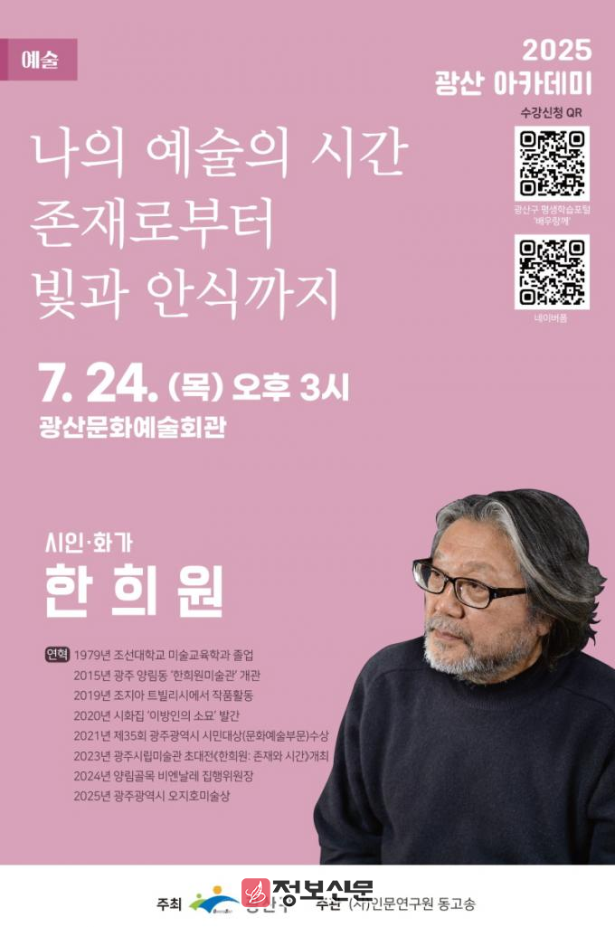 박병규 광산구청장은 “지역 대표 거장 한희원 작가와 함께하는 7월 광산아카데미는 무심코 지나쳤던 나만의 ‘예술의 시간’을 깨닫고, 새기는 시간이 될 것”이라며 “한희원 작가와 많은 시민이 함께 일상 속 예술, 예술 속 일상을 이야기하는 자리가 되길 기대한다”고 밝혔다.