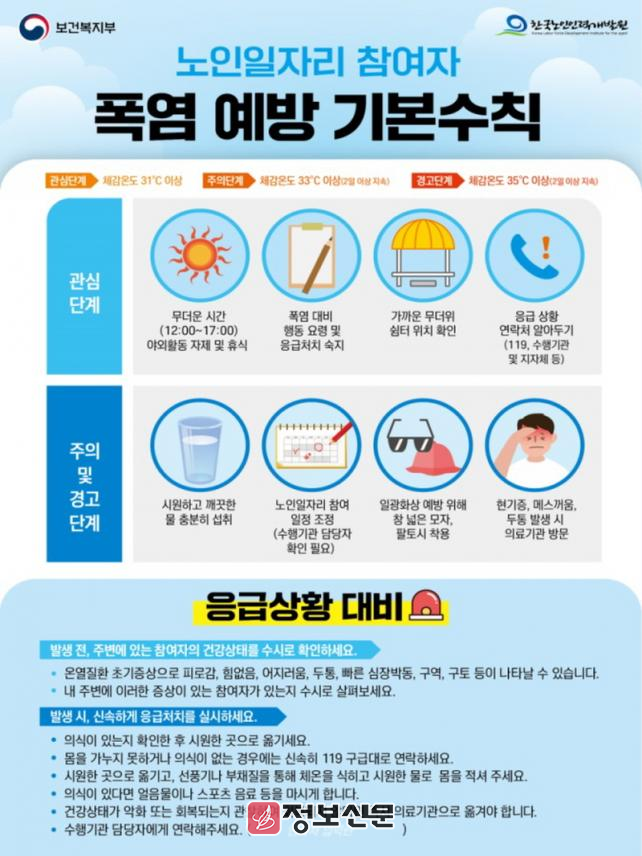 동시에 시는 혹서기(6~9월)에는 △혹서기 물품 지원 △활동 시간 변경 △실내 활동 전환 △야외 활동 전면 중단 등 탄력적인 일자리 운영으로 무더위에 따른 사고 위험을 줄일 계획이다. 이에 앞서 시는 혹서기 노인일자리 사업 운영 지침을 각 수행기관에 배포해 기관 자체적으로도 참여 노인의 안전관리 및 건강 보호를 강화할 수 있도록 조치한 바 있다.
