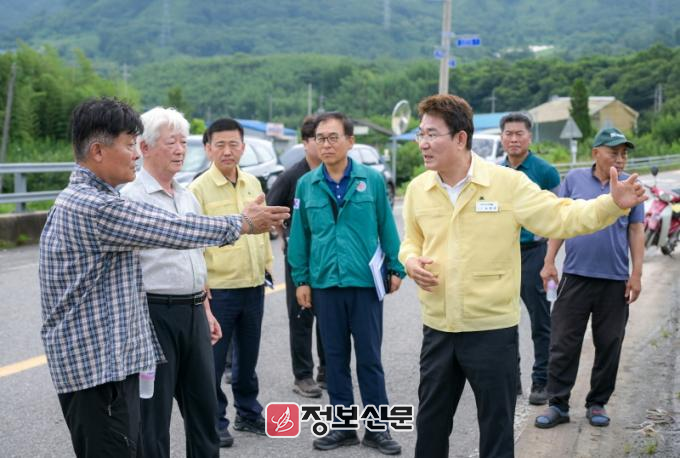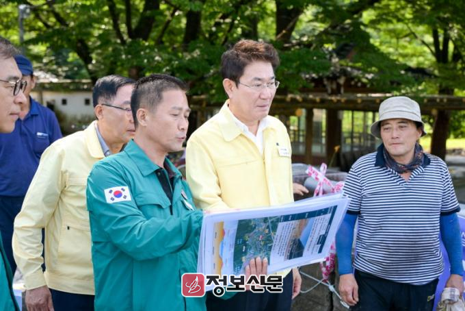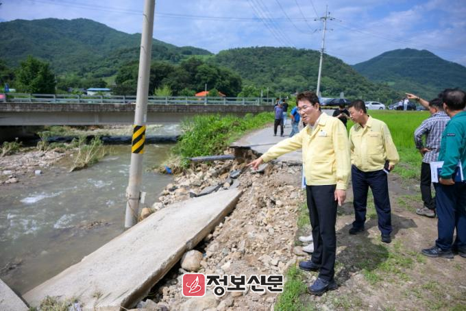 시에 따르면 황전면 248.5mm, 시내 평균 120mm의 비가 내리는 등 집중호우로 인해 일부 도로 침수, 농경지 피해 등이 접수됨에 따라, 홍수경보 발령 지역인 황전천 용서교 및 회룡천 하천제방 유실 현장을 직접 점검했다.