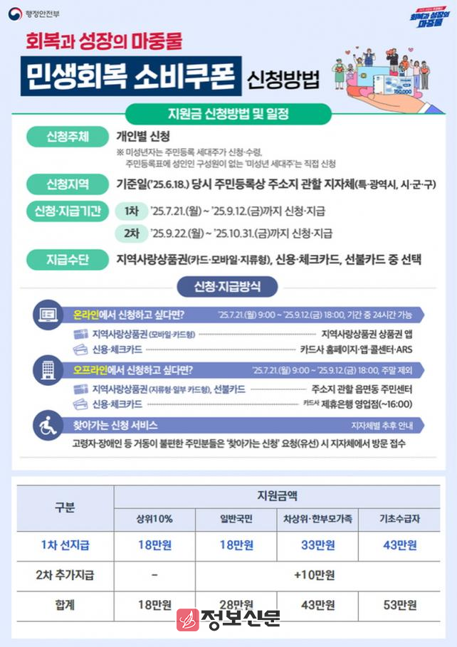 신청은 오는 21일부터 9월 21일까지 전 국민을 대상으로 차등 지급하는 1차분 민생회복 소비쿠폰과 이어 9월 22일부터 10월 31일까지 소득 하위 90% 시민을 대상으로 일괄 지급하는 한 2차분 민생회복 소비쿠폰의 2차례로 나뉘어 진행된다.