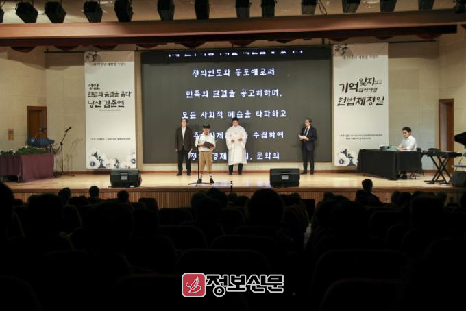 연극에서는 헌법 초안을 놓고 열띤 토론을 벌이고, 1948년 7월 17일 헌법을 공포하는 낭산 선생의 모습이 연출돼 당시의 열정을 현재에 전했다.