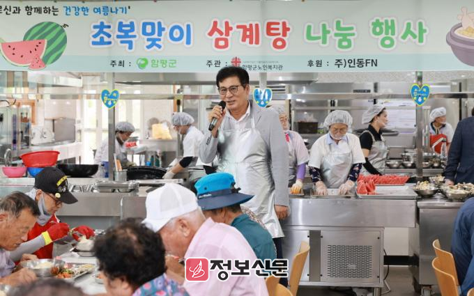 이번 행사는 ㈜인동에프엔의 따뜻한 후원으로 마련됐으며, 연일 이어지는 무더위 속에 어르신들이 원기 회복과 활기찬 여름을 보내실 수 있도록 기획됐다. 특히, 이상익 함평군수도 이날 삼계탕 배식에 참여해 어르신의 안부를 여쭈며 정성을 담아 삼계탕을 대접했다.