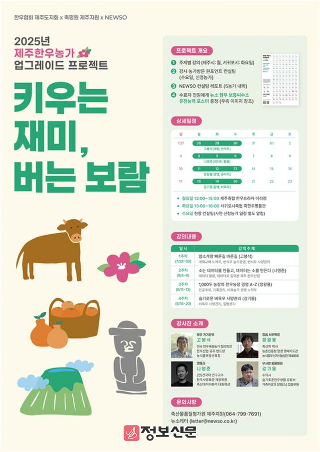 이번 프로젝트는 “키우는 재미, 버는 보람”이라는 슬로건 아래, 제주지역 한우농가의 경쟁력 강화와 소득 향상, 지속가능한 축산 기반 마련을 목표로 추진되며, 실질적인 교육과 현장 중심 맞춤형 컨설팅을 통해 한우농가가 직접 체감할 수 있다는 점에서 현장의 기대감도 크다.