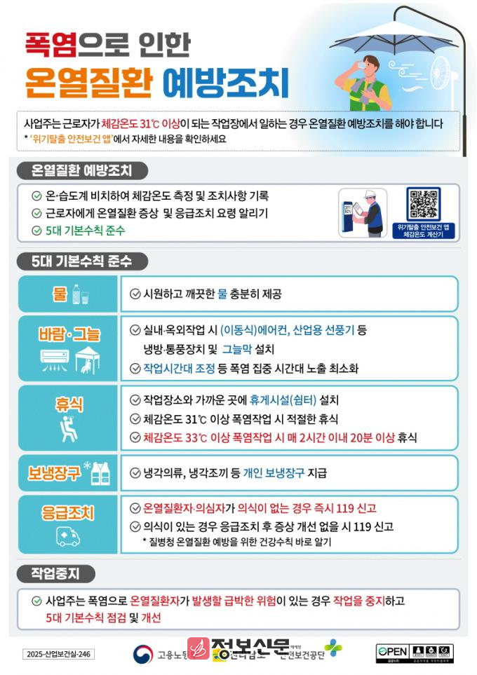 전남도는 폭염 속 온열질환을 예방하기 위해 ▲물 자주 마시기(갈증 느끼지 않도록 정기적 섭취) ▲한낮 야외 활동 자제(오후 2시~5시 피하기) ▲시원한 옷차림과 휴식(매 2시간 작업 후 20분 이상 휴식) ▲어지러움, 근육경련 시 즉시 중단하고 119 신고 등 도민과 작업자에게 예방 수칙 준수를 당부했다.