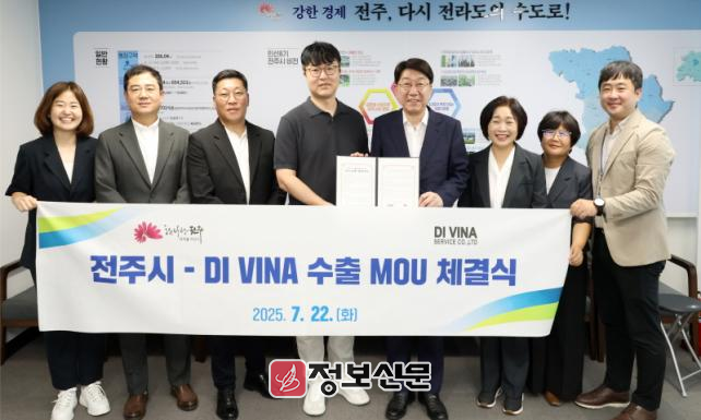 전주시와 DI VINA는 22일 전주시장실에서 우범기 전주시장과 김완엽 대표 등 양 기관 관계자들이 참석한 가운데 ‘가공식품 및 농산물 수출 업무협약(MOU)’을 체결했다.