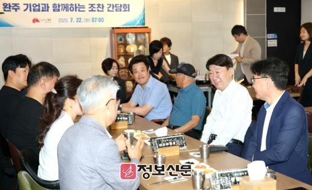 우범기 시장은 22일 이른 아침 전북혁신도시 내 한 식당에서 완주 기업인들과 조찬 간담회를 갖고 지역경제 활성화와 완주·전주 통합에 대한 다양한 의견을 나눴다.