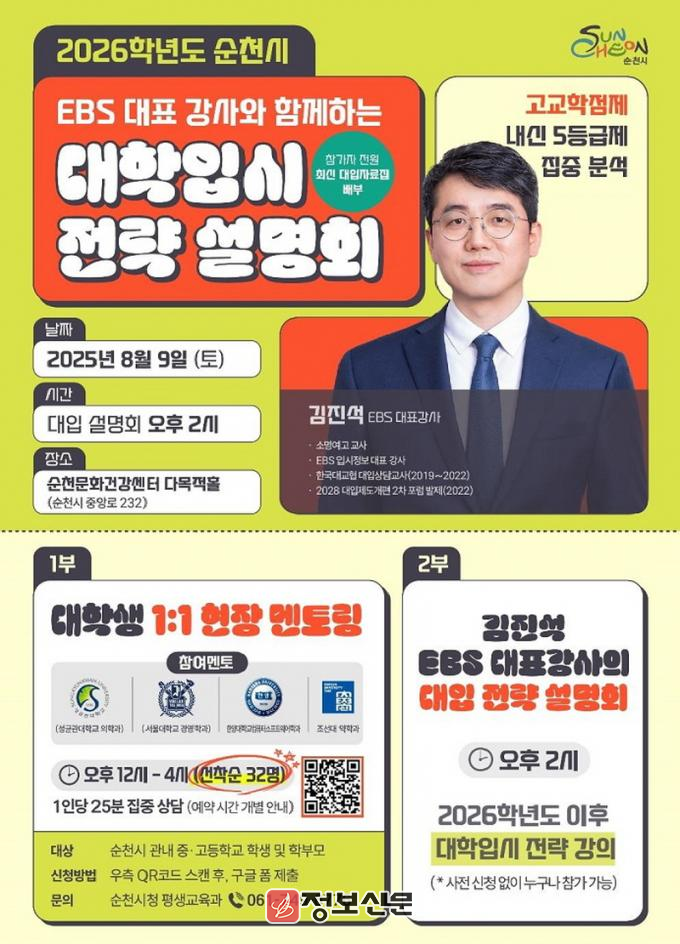 이어지는 2부에서는 EBS 진로진학 대표강사 김진석 강사의 특강이 열린다. 김 강사는 약 100분간 2026학년도부터 적용되는 새로운 입시제도와 전략을 제시하고, Q&A 시간을 통해 궁금증을 해소할 예정이다. 참석자 전원에게는 최신 대학 입시 자료집도 배부된다.