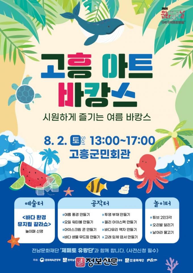 이번 ‘고흥아트바캉스’는 시원하게 즐기는 여름 바캉스를 주제로 ▲놀이패 신명의 환경 뮤지컬<삼총사의 대모험> ▲미니 운동회 ▲고래 입체 엽서 만들기 ▲여름 풍경 만들기 ▲바다생물 무드등 만들기 등 다양한 프로그램이 준비돼 있다.