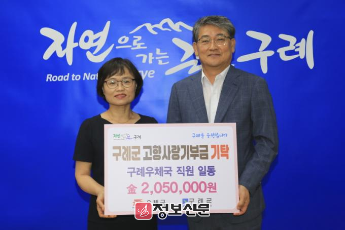 구례우체국은 지난해에 이어 올해에도 직원들이 모금한 205만 원의 고향사랑기부금을 구례군에 전달하며, 지역과의 협력 증진과 상생발전에 힘을 보탰다.