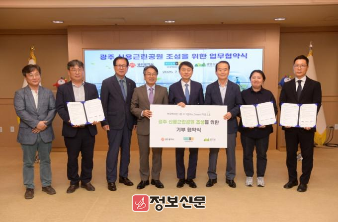 광주광역시(시장 강기정)는 현대백화점그룹, ㈔생명의숲과 22일 시청 비즈니스룸에서 ‘광주 신용근린공원 조성을 위한 기부 협약식’을 체결했다.