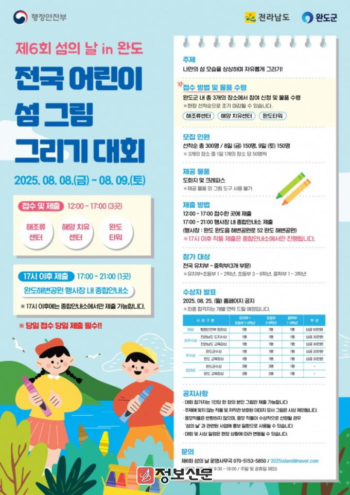 어린이 섬 그림그리기 대회는 8월 8~9일 완도해조류센터·해양치유센터·완도타워 일대에서 진행된다. 전국의 유치부부터 중학생까지 누구나 참여할 수 있으며, ‘나만의 섬’을 주제로 운영된다. 우수작은 표창장과 부상이 수여된다.