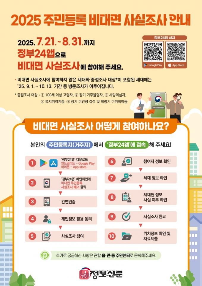 이번 조사는 7월 21일부터 8월 31일까지 스마트폰을 활용한 온라인 조사로 먼저 진행되며, ‘정부24앱’을 통해 간편하게 참여할 수 있다. 별도의 회원가입 없이 일회성 간편 인증만으로 조사에 참여할 수 있으며, 주소지가 동일한 경우 세대원 중 1명이 대표로 세대 전체에 대한 사실조사에 응답할 수 있다.