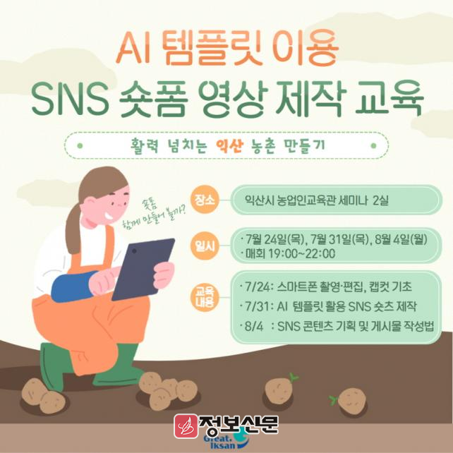 익산시농업기술센터는 24일부터 3회(총 9시간) 과정으로 '인공지능(AI) 템플릿 이용 사회관계망서비스(SNS) 숏폼 영상 제작' 교육을 진행한다.