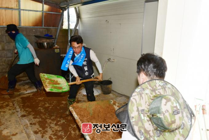 이날 박필순 의원과 의회사무처 직원 12명은 피해 현장을 찾아 피해 주택 뒷편 산에서 밀려 내려온 흙더미와 잔해물을 정리하고, 진입로 주변 토사 제거 및 정비 작업에 구슬땀을 흘렸다.