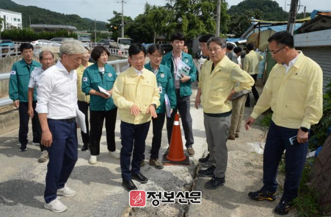 사진1=박병규 광산구청장이 8일 오전 강기정 광주시장과 함께 특별재난지역으로 선포된 어룡동을 찾아 폭우 피해 현장을 살폈다.