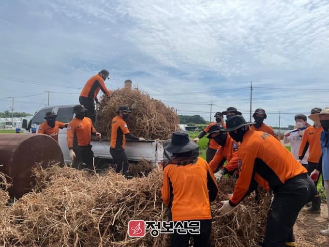 지난 8일 나주소방서 직원 30여 명과 의용소방대원 50여 명은 노안면 계림리의 한 비닐하우스 농가를 찾아 무더운 날씨 속에서도 침수로 망가진 시설을 정비하고 수해 폐기물 수거·운반 등 주민들의 생업 복귀를 위해 구슬땀을 흘렸다.