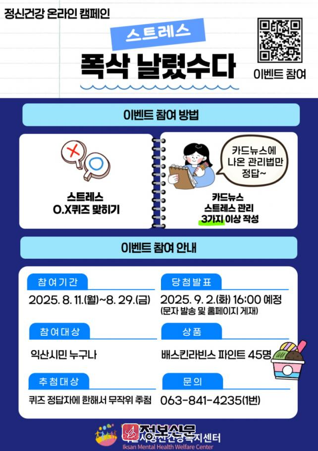 캠페인은 익산시정신건강복지센터 누리집에 게시된 큐알(QR)코드를 통해 스트레스 관련 O·X 퀴즈를 풀고, 제시된 스트레스 관리법 중 3가지 이상을 작성하는 방식으로 진행된다.
