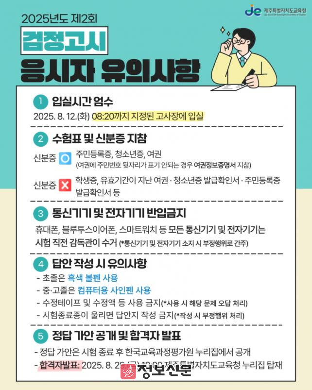 제주특별자치도교육청은 지난 1일 누리집에 시험 당일인 12일 오전 8시 20분까지 지정된 고사장 입실 및 수험표, 신분증, 흑색볼펜(초졸), 컴퓨터용 사인펜(중·고졸) 지참하며 휴대전화, 전자
