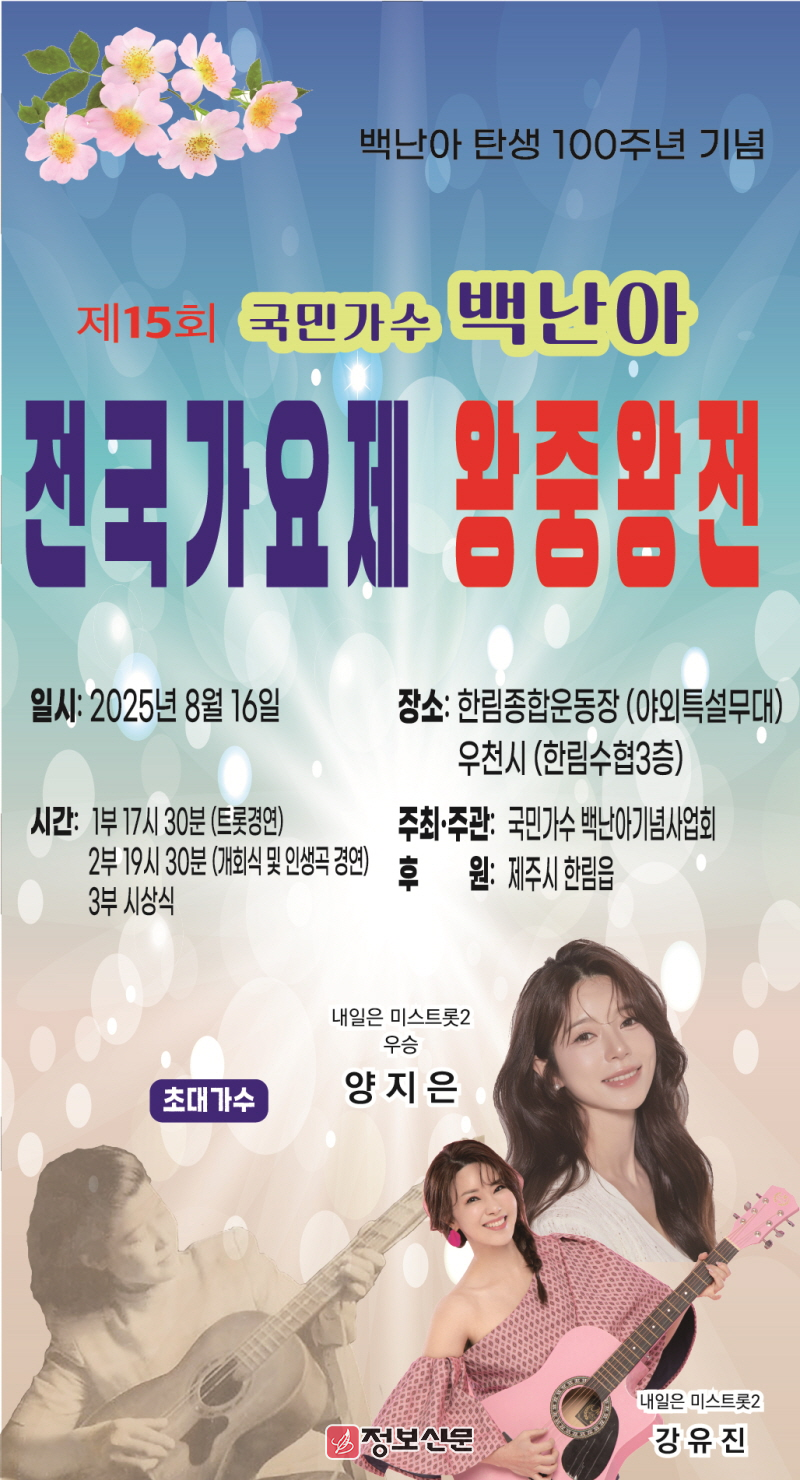 국민가수 백난아기념사업회(회장 오경철)가 주최하는 이번 가요제는 백난아 탄생 100주년을 기념해 역대 수상자들이 참여하는 왕중왕전으로 진행된다.