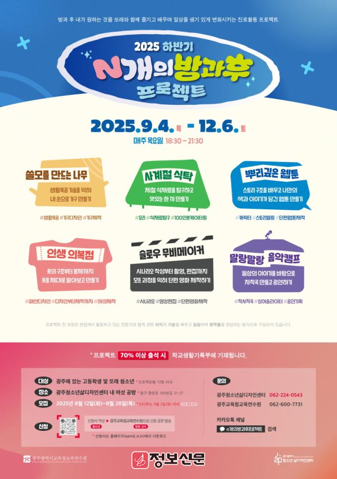 신청은 광주청소년삶디자인센터 누리집(https://samdi.or.kr)에서 지원서를 작성해 담당 교사에게 제출하면 된다. 자세한 사항은 연수기획부(600-7731), 삶디센터(062-224-0543) 또는 카카오톡 채널 ‘n개의 방과후 프로젝트’로 문의하면 된다.