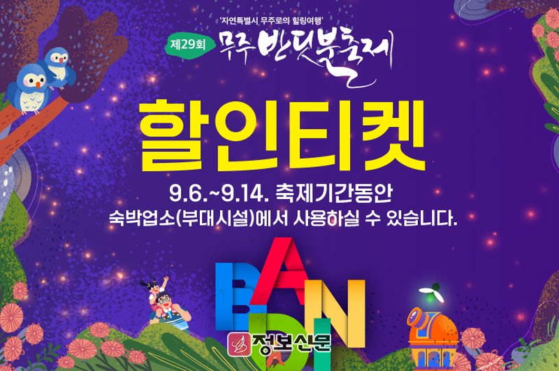 무주군에 따르면 9월 6일부터 14일까지 무주반딧북축제 누리집(www.firefly.or.kr) ‘축제 자료마당-관광객 인센티브’ 페이지의 할인 티켓을 출력해서 제시하면 이용 업소별로 다양한 혜택을 누릴 수 있다.