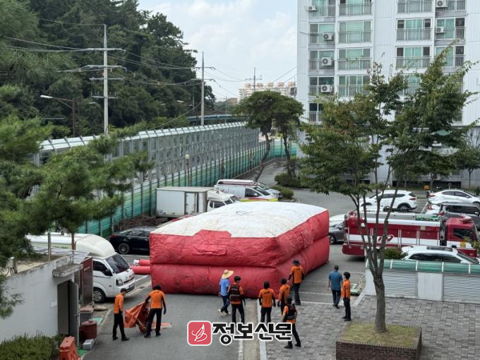 훈련 내용은 △공기안전매트 전개 및 기능 점검 △인명구조 대응방안 토의 △작동원리와 주의사항 숙지 △공동주택 관계자 대상 관리 요령 교육 등으로 진행됐다. 이번 아파트 훈련에 사용된 공기안전매트는 최대 10층 높이에서도 비상탈출이 가능하며 전개시간은 약 2분가량 소요됐다.