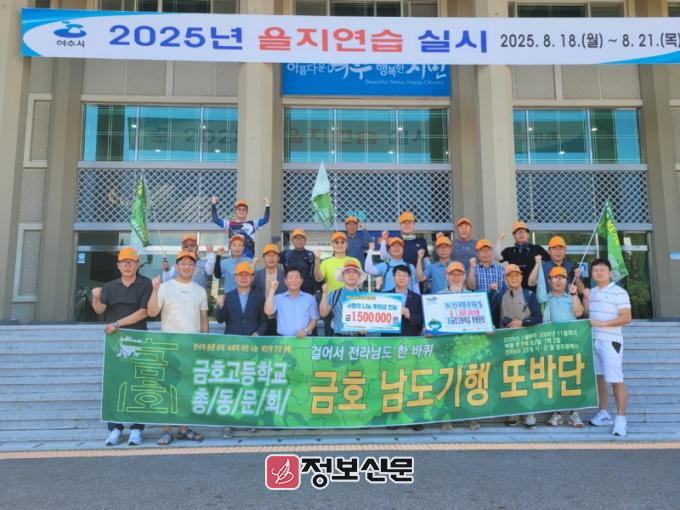 ![]() ▲ 여수시(시장 정기명)는 8월 16일 시청 현관에서 광주 금호고등학교 총동문회(회장 김성은) 걷기 동아리 ‘금호 남도기행 또박단(단장 김재광)’이 저소득가정 아동 지원을 위한 장학금 150만 원의 후원증서를 전달했다고 밝혔다.
