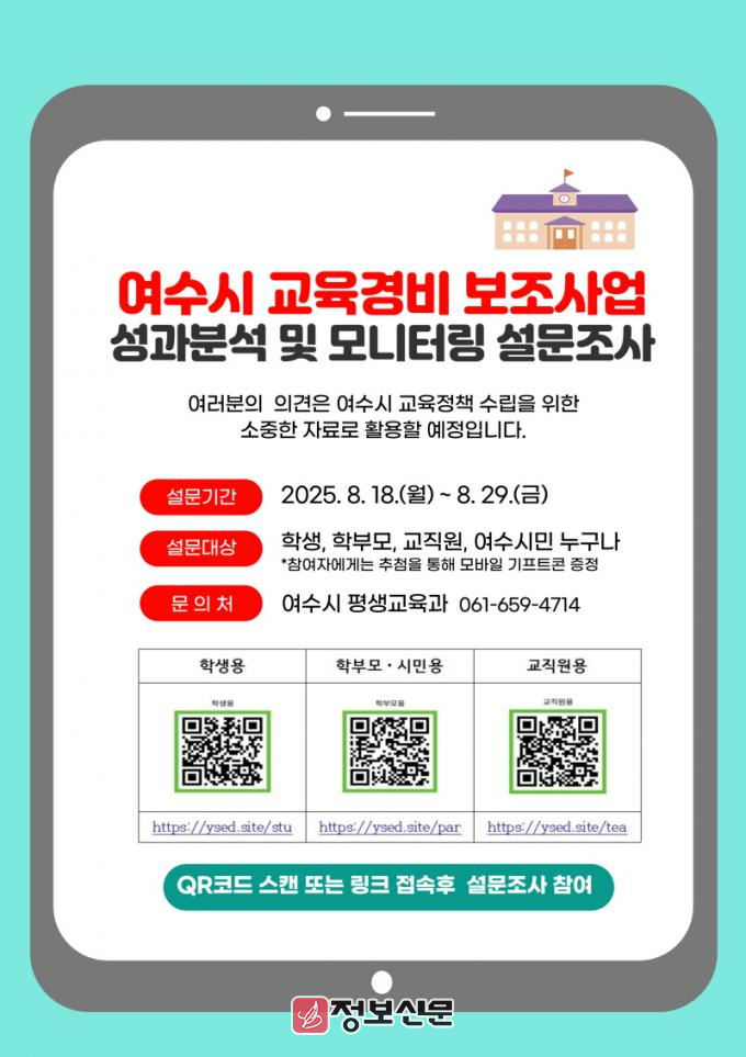 한편, 여수시는 올해 교육경비 예산 총 100억 원을 편성해 44개 사업을 여수교육지원청과 각급 학교에서 추진하고 있으며 설문 참여 과정에서 현재 추진 중인 사업 현황도 함께 확인할 수 있다.