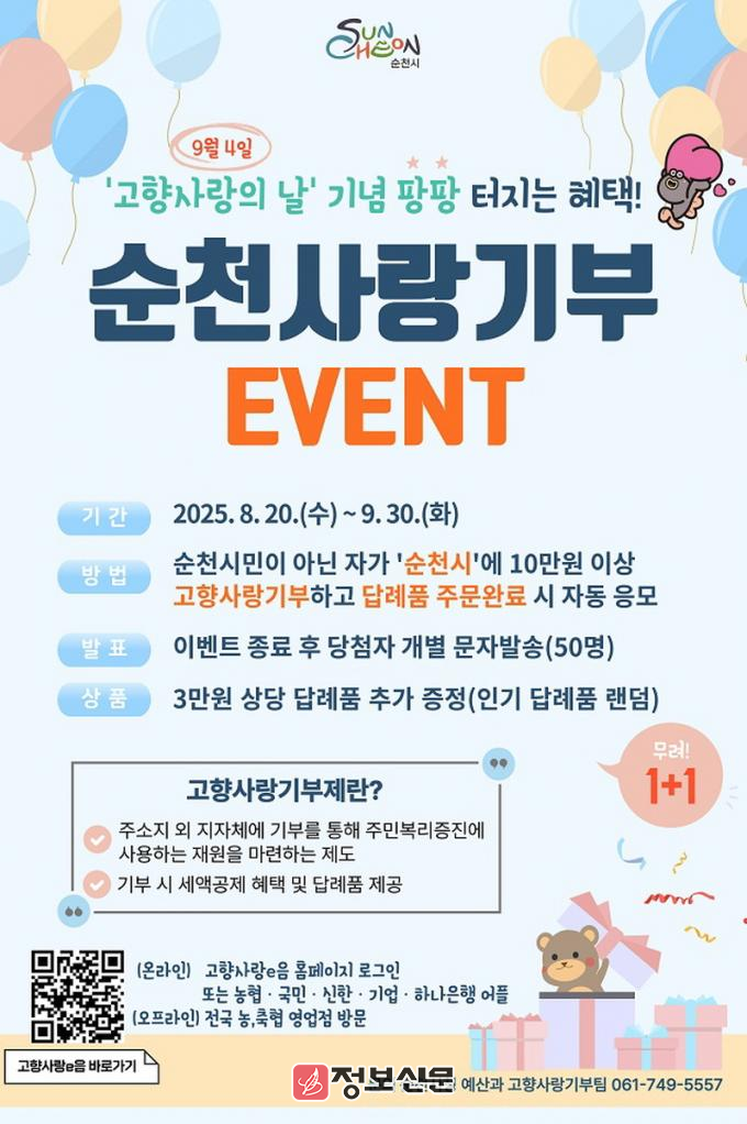 ![]() 순천시, ‘고향사랑의 날’ 기념 고향사랑기부제 특별이벤트 실시 |