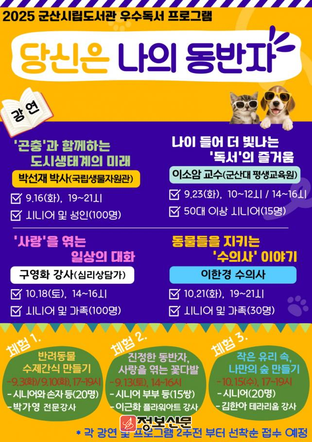 9월 3일 ‘반려동물 수제간식 만들기’로 프로그램을 시작하는 시립도서관은 이어 ▲박선재 국립생물자원관 박사의 ‘곤충과 함께하는 도시생태계의 미래’ 강연 ▲이소암 교수의 ‘나이 들어 더 빛나는 독서의 즐거움’ 강연 ▲진정한 부부를 위한 꽃다발 만들기 체험이 이어진다.