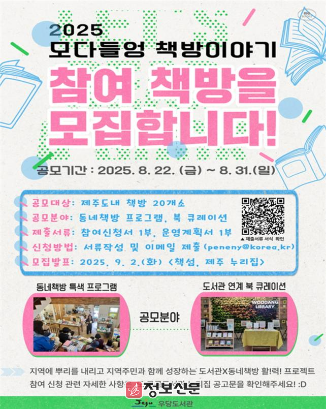 신청한 책방을 대상으로 ▲프로그램 기획의 타당성, ▲실행 가능성, ▲지역 문화 거점으로서의 역할 등을 종합적으로 평가해 최종 20곳을 선정하며, 결과는 9월 2일(화) 우당도서관 누리집 ‘책섬, 제주’에 공지할 예정이다.