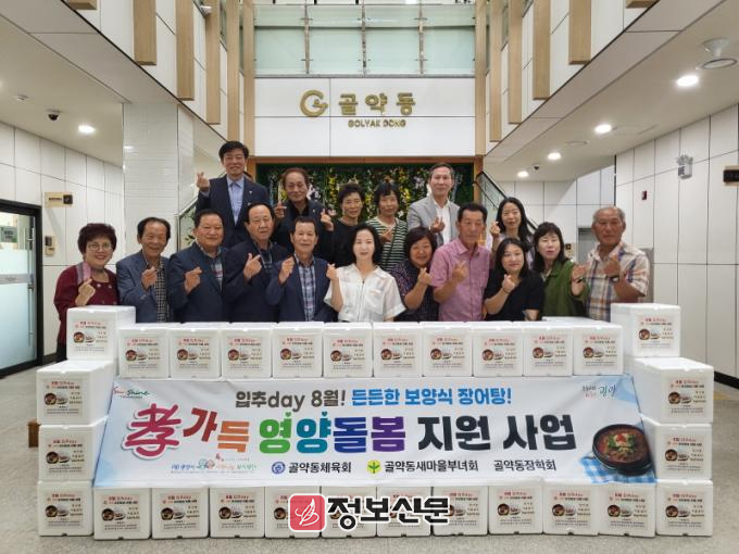 이번 활동은 골약동체육회(회장 강준열)와 새마을부녀회(회장 문혜경), 장학회(회장 박효근) 등으로 구성된 「골약동 孝지킴이단」 이 참여해 의미를 더했다. 이들은 연일 지속되는 폭염 속 건강관리에 취약한 어르신 35가구를 대상으로 지역 특산 식재료로 구성한 보양식 꾸러미를 직접 전달했다. 꾸러미에는 하포마을 장어탕, 고길마을 두부과자, 통사마을 여름김치가 포함돼 어르신들의 입맛과 건강을 함께 고려해 구성됐다.