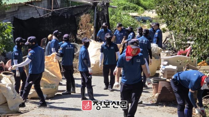 담양경찰서는 특별재난지역 선포로 을지연습이 제외된 기간(7월 14~20일)을 활용해 피해 복구 지원에 적극 나섰다. 매일 15명의 인력을 수북 정중리, 무정 영천리, 창평 일산리 등 현장에 투입해 침수된 비닐하우스와 농경지 정리에 힘을 보탰다. 특히 무정면 영천리의 한 농가에서는 비닐하우스가 진흙과 흙더미로 뒤덮여 농작물을 건질 수 없는 상황이 벌어졌다.