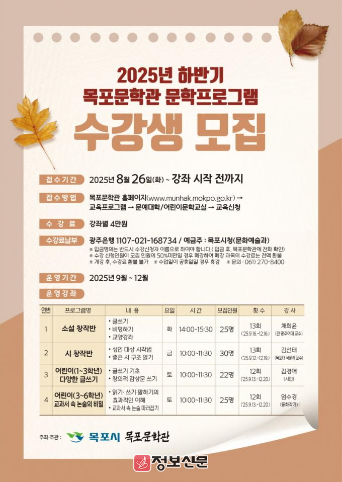 ![]() 목포문학관, 2025 하반기 문학교육프로그램 수강생 모집 |