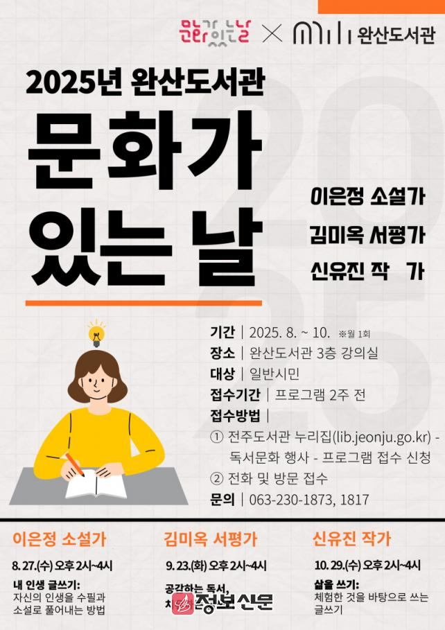 ![]() 완산도서관, ‘문화가 있는 날’ 글쓰기 강연 운영 |