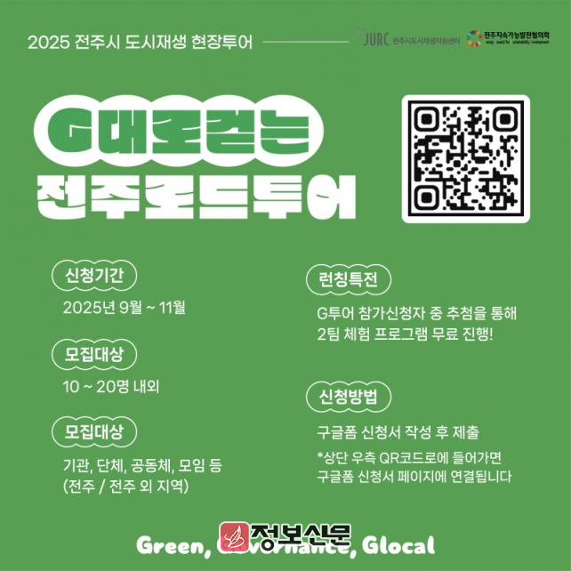 한편, 전주 G-투어에 대한 사항은 전주시도시재생지원센터(063-281-9313) 또는 전주지속가능발전협의회(063-282-2959)로 문의하면 자세한 안내를 받을 수 있다.