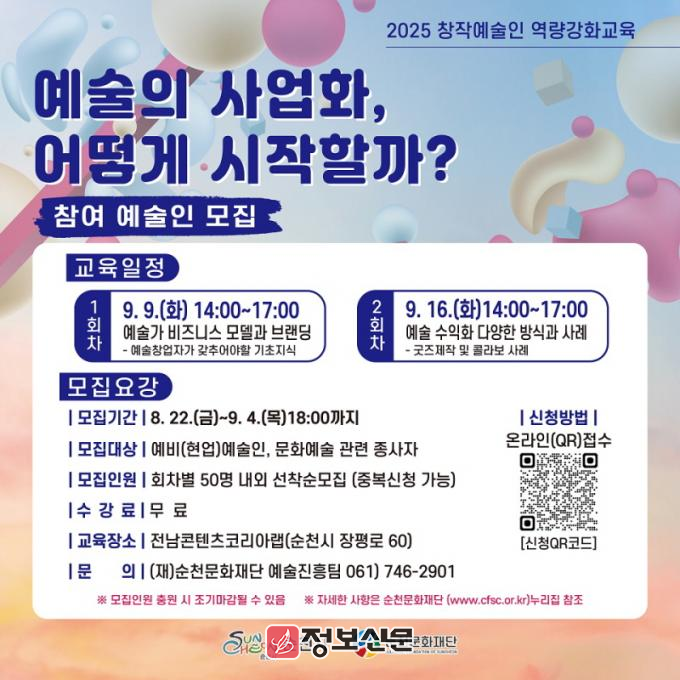 순천문화재단 관계자는 “이번 교육은 예술인들이 창작활동을 지속 가능하게 이어가기 위해 반드시 필요한 ‘사업화 역량’을 강화하는 데 초점을 맞췄다”며 “지역 예술가들이 스스로 기획·운영 능력을 키워 안정적인 창작 기반을 마련할 수 있길 기대한다”고 말했다.