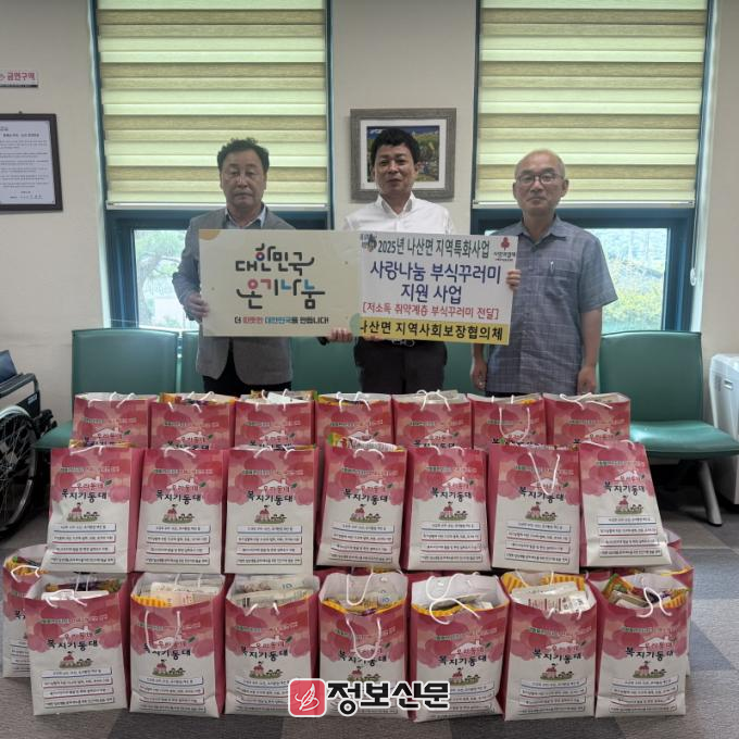 이번 사업은 나산면 지역사회보장협의체 특화사업의 일환으로 추진됐으며 나산면 직원들도 동참했다. 꾸러미에는 여름철 입맛을 돋울 수 있는 즉석 국류와 간편 조리 식품 등 필수 식료품이 담겼다. 특히, 지역사회보장협의체와 나산면은 가정을 방문해 꾸러미를 전달하며 대상자의 건강 상태를 살폈다.