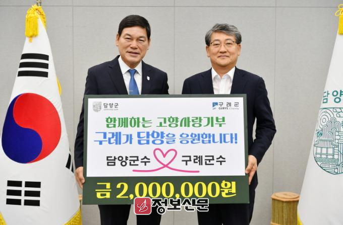 담양과 구례는 곡성, 순창과 함께 ‘구곡순담 장수벨트 행정협의회’를 구성해 고령화 대응과 노인복지 분야에서 공동 대응하는 등 오랜 기간 협력해 왔으며, 앞서 지난 4월 정철원 군수가 구례군에 고향사랑기부금을 기탁하기도 했다.
