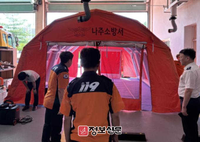 나주소방서는 최근 재난 대응 시 통합지휘체계 구축과 원활한 협업을 위해 지휘텐트, 대용량 파워뱅크, 고출력 이동식 스피커를 신규 도입했다고 27일 밝혔다.