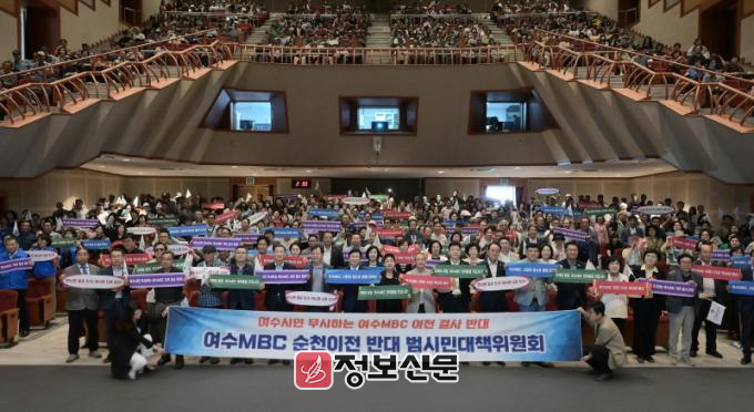 ‘여수MBC 순천이전 반대 범시민대책위원회(이하 대책위)’가 27일 오후 2시 여수시민회관에서 출범식을 갖고, 선언문을 통해 “시민 의견수렴 없는 일방적 이전추진을 즉각 중단하고 철회하라”며 이같이 밝혔다.