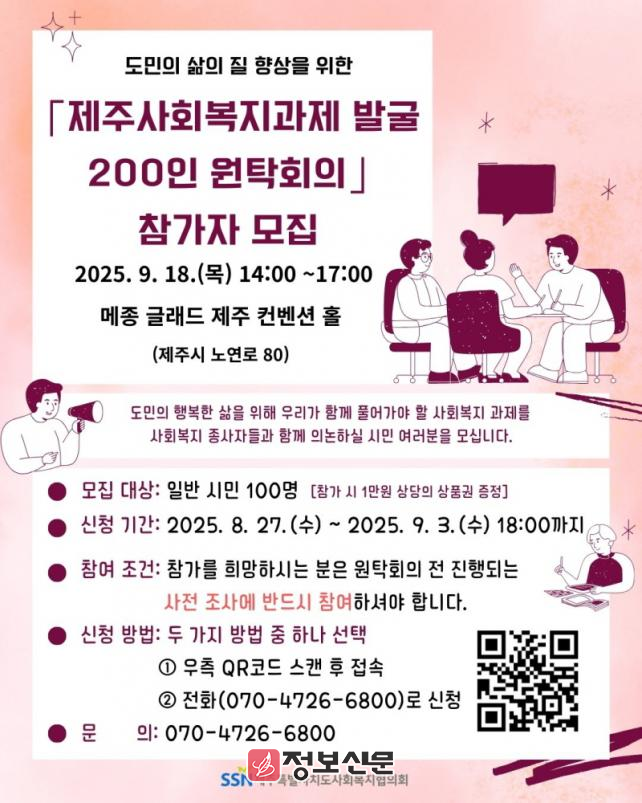 ![]() 제주특별자치도사회복지협의회, 제주사회복지과제 발굴 200인 원탁회의 시민참여자 모집 |