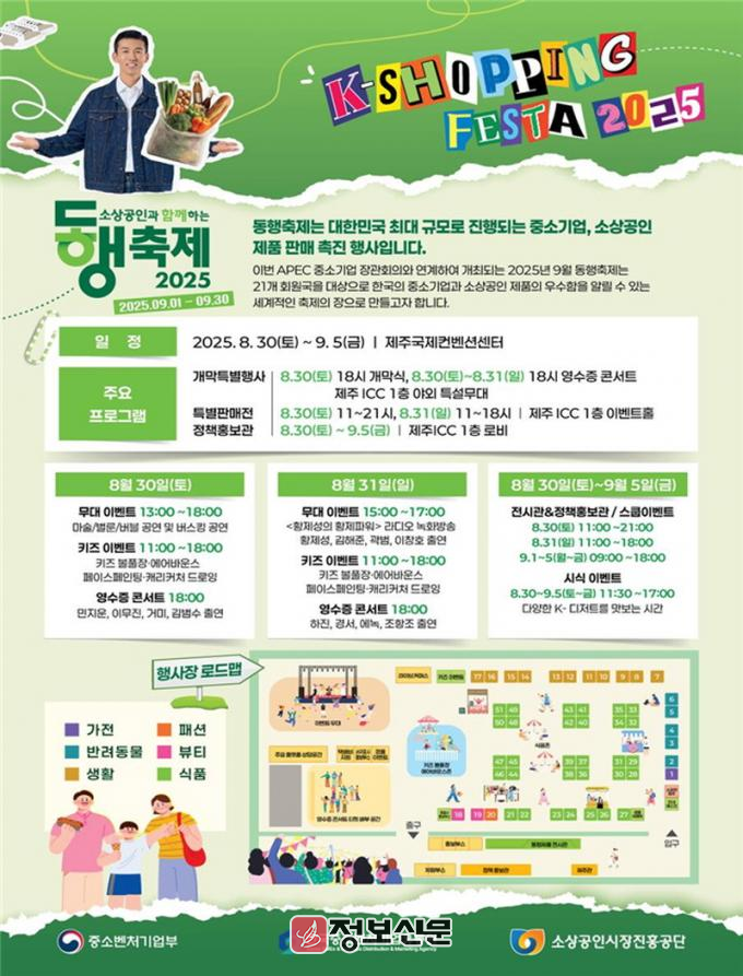 중기부는 8월 30일(토) 오후 6시, 제주국제컨벤션센터(제주 ICC)에서 「9월 동행축제 개막식」을 개최한다. 이번 행사는 역대 최대 규모로 개최되는 9월 동행축제의 시작을 알리는 행사다. 8월 30일부터 31일까지 이어지며, 소상공인 제품 판매전부터 어린이 놀이‧체험관, 영수증 콘서트까지 다채롭게 준비하였다.