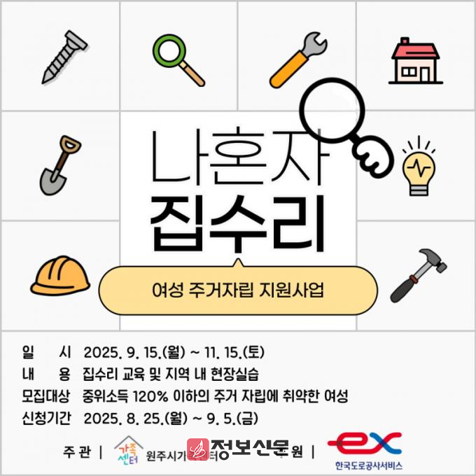 이번 사업은 원주 관내 중위소득 120% 이하 주거 취약 여성을 대상으로 하며, 특히 미혼모와 여성 한부모 가정이 우선 지원 대상이다. ‘나 혼자 집수리’ 프로그램은 9월 15일부터 10월 27일까지 매주 월요일 저녁 7시 원주시가족센터에서 진행된다.