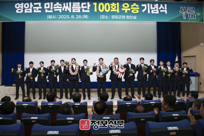 이날 기념식은 2017년 창단한 영암군민속씨름단이 이달 1~7일 충북 영동군에서 열린 영동세계국악엑스포장사 씨름대회 단체전 우승으로 통산 100승의 금자탑을 쌓은 성과를 축하하는 자리.